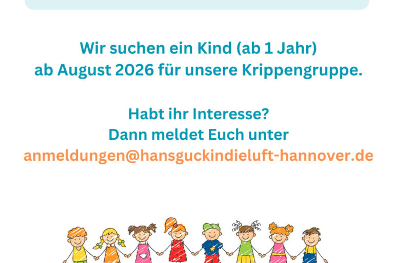Wir suchen ein Kind (ab 1 Jahr) ab August 2026 für unsere Krippengruppe! Meldet euch gerne unter anmeldungen@hansguckindieluft-hannover.de und vereinbart einen Kennenlern- und Besichtigungstermin. Wir freuen uns auf euch!
